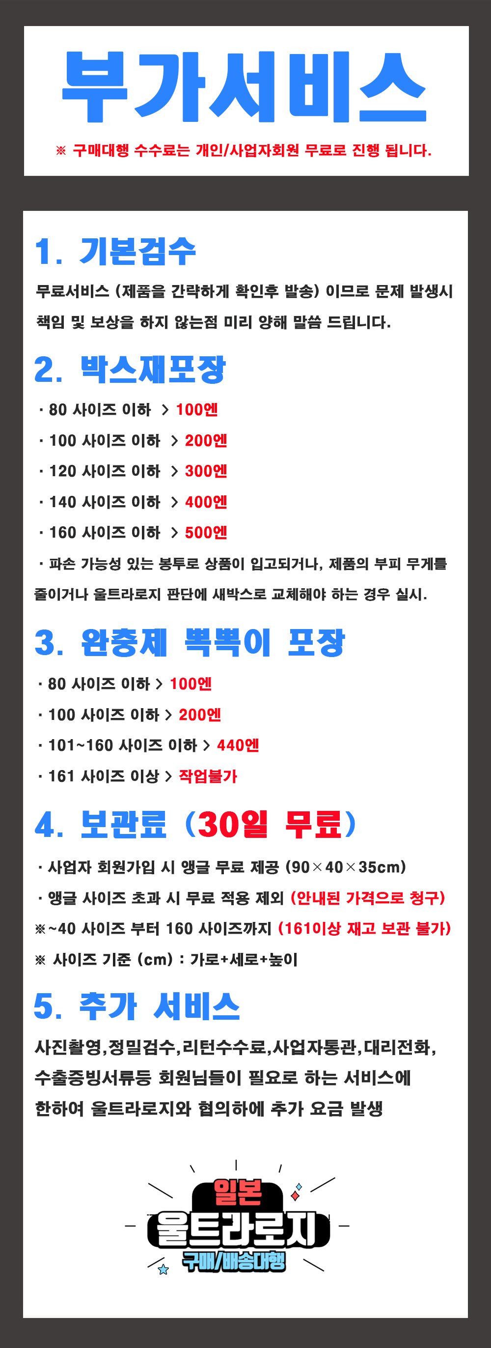1. 대형화물 추가 ( 상품의 무게·사이즈가 일반 택배사의 인계 기준을 초과할 경우, 규격외 화물로 분류되어 대형화물 택배사로 인계되며 추가 운임이 청구됩니다. ) 2. 추가 운임 부담 ( 국제 운송료 외에 발생하는 추가 운임은 국내 택배 비용으로 고객님께서 부담하셔야 합니다. ) 3. 대액통관수수료 ( 박스별 합계 20만엔 이상 시 청구 / 예: 10만엔×2박스 = 청구 없음 / 항공 1,500엔 · 해상 7,000엔 ) 4. 사이즈·무게 초과 비용 ( 추가 비용 산정 방법은 아래 기준에 따라 적용됩니다. ) 5. 항공 출고 일정 ( 주 5회 ( 월~목 출고 → 다음 날 항공 배송 / 금요일 출고 → 월요일 항공 배송 ) 6. 해상 출고 일정 ( 주 2회 ( 월/화 출고 → 수요일 출항 / 수/목 출고 → 금요일 출항 / 예) 금요일 출고 시 → 다음 주 수요일 출항 ) 7. 재고 보관 ( 최초 가입 30일 무료 / 선반 1단 (90×40×35cm): 2,000엔 / 선반 1대 5단 (90×40×180cm): 8,000엔 ) 8. 반품 수수료 ( 박스 1개당 100사이즈 이하 500엔 / 120사이즈 이상 1,000엔 ) 반품 운송료 별도차감 / 비닐·종이로 올경우 또는 박스 훼손 시 박스비 청구 ) 9. 대금 상환/은행입금 수수료 ( 대금상환 : 1,000엔 (사전 연락 필수) / 은행입금 : 500엔 ) |